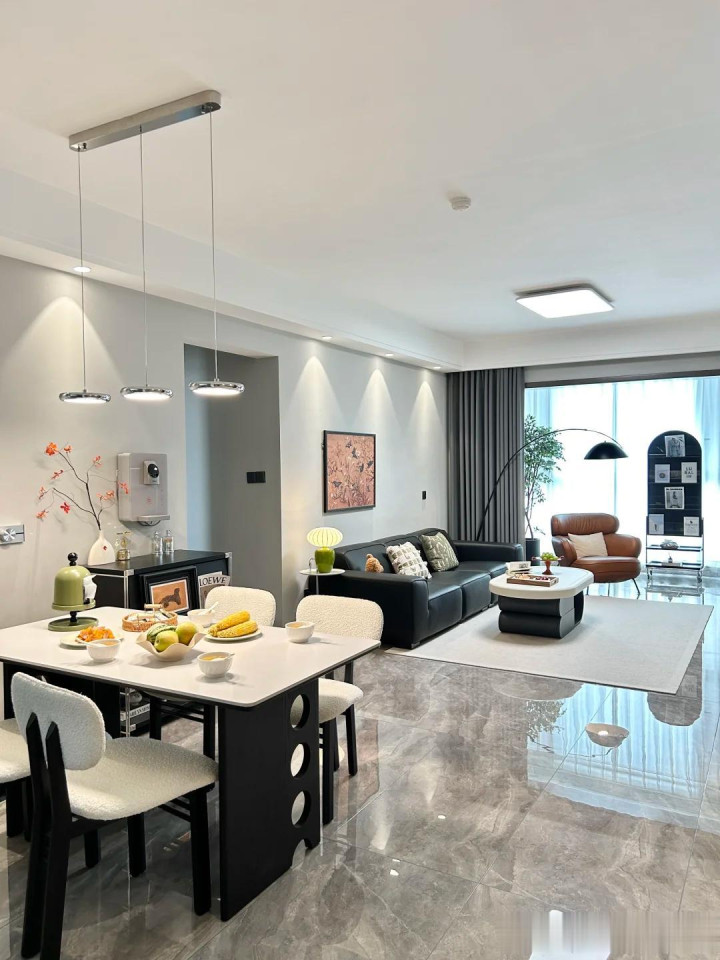 把餐桌尽量靠近客厅,甚至可以和沙发区连在一起,视觉上显大,动线也顺畅。