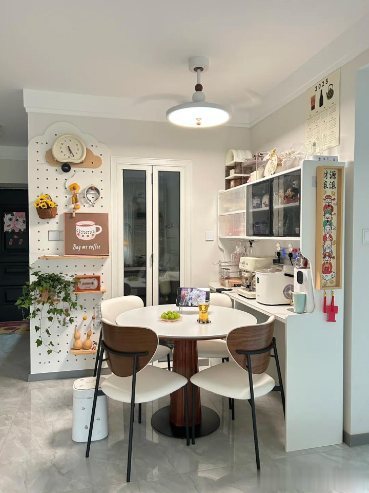 我家是开放式厨房+餐厅,选了张圆桌,氛围感一下子好了不少,吃饭都香了!