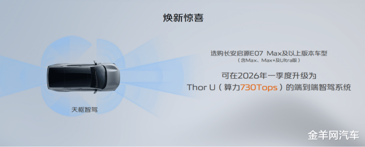 基于长安汽车全栈自研的SDA天枢架构所具备的“硬件可插拔”能力,长安启源E07 Max及以上版本车型(含Max、Max+及Ultra版),预计将在2026年一季度升级搭载高算力Thor U(算力730Tops)的端到端智驾辅助系统。